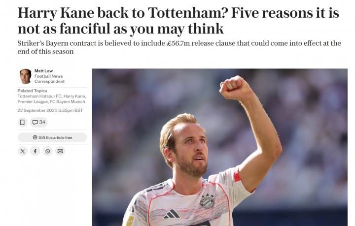 09月23日讯 英媒《每日电讯报》首席记者马特-劳撰文,谈到明夏凯恩重返热刺的可能性,他表示这位英格兰前场球员可能在未来重返老东家,此事并非天方夜谭。