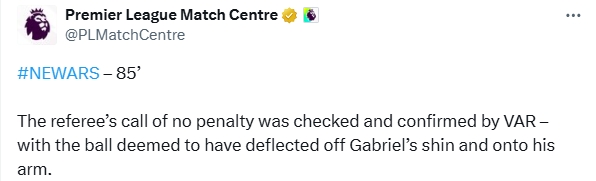 英超官方解释:“裁判 不是十二码球的决定经过了VAR的审核和确认,球被判定从加布里埃尔的小腿上弹到了他的手臂上。”