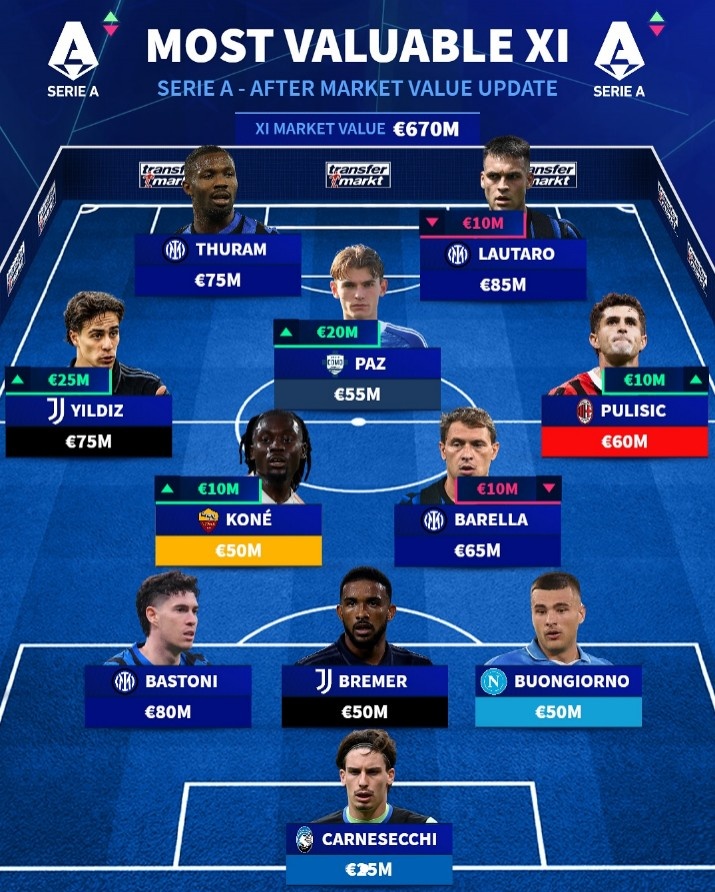 10月8日讯 德转更新了球员身价排名,意甲最贵杆位11人也随之出炉,国米的劳塔罗和图拉姆领衔锋线,AC米兰球员普利西奇入选。