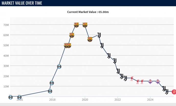 据德转数据,阿图尔与尤文的合同将于2027年到期,这位曾经的天才中场球员也从巅峰期 时期7000万欧元身价,跌至如今的500万欧元。