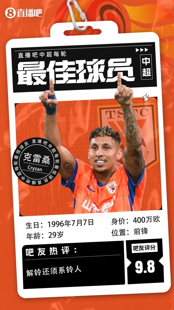【】中超第22轮最佳球员评选结果出炉,克雷桑当选本轮最佳!克雷桑在山东泰山与青岛西海岸赛事 中定位球直接破门+双响,打破个人中超赛场4个多月球荒。克雷桑本赛季第三次获得评选中超当轮最佳球员。