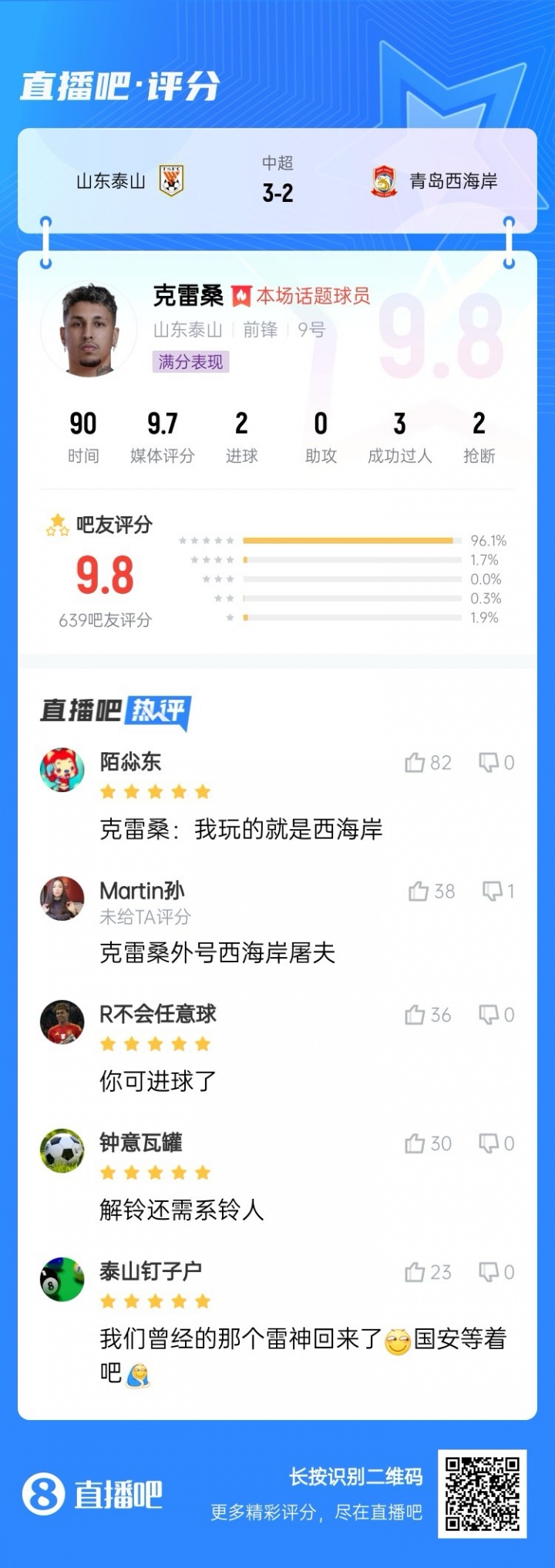 【】中超第二轮最佳球员:克雷桑毫无悬念当选,评分9.9!