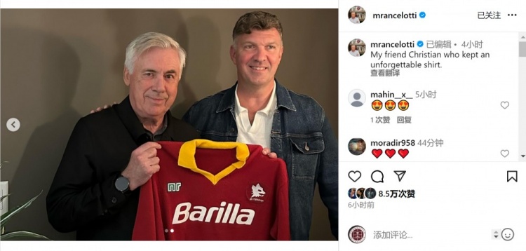 安切洛蒂获赠自己效力罗马期间的运动活动 服 ,他在社交媒体上晒照:“我的朋友克里斯蒂安收藏了一件令人难忘的运动活动 服 。”