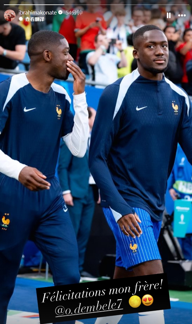 9月23日讯 在登贝莱夺得2025年金球奖后,他在法国队的队友、利物浦后场球员科纳特通过社交媒体祝贺了他。