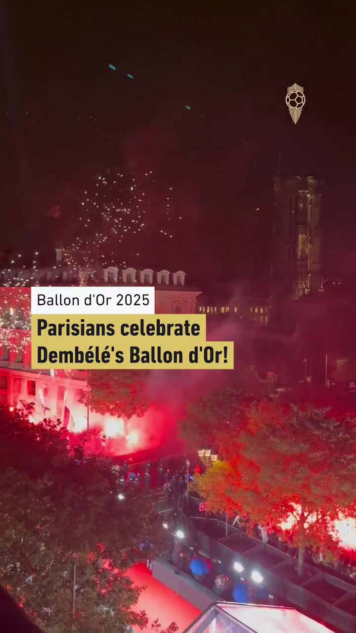 9月23日讯 巴黎前场球员登贝莱获得2025年金球奖,巴黎球迷放烟花庆祝。