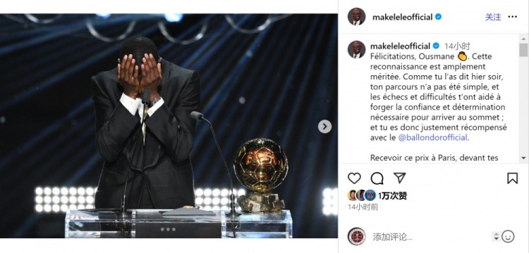 9月24日讯 法国足坛名宿马克莱莱更新社媒动态,祝贺登贝莱获得金球奖。