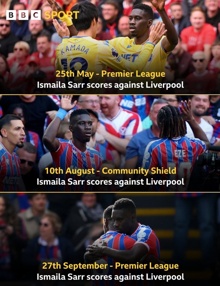 9月27日讯 在本轮英超水晶宫对阵利物浦的赛事 中,萨尔率先破门。