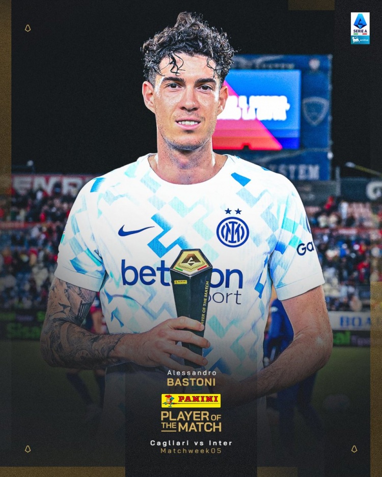 9月28日讯 官方消息,国米后场球员巴斯托尼当选卡利亚里0-2国米的全场最佳球员。