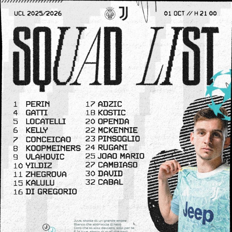 9月30日讯 北京时间10月2日凌晨3时,欧冠职业联赛 第2轮尤文图斯将在客场应战 对战比利亚雷亚尔。今日尤文公布了本场赛事 的21人名单,苏超直播弗拉霍维奇、伊尔迪兹、戴维、热格罗瓦领衔。