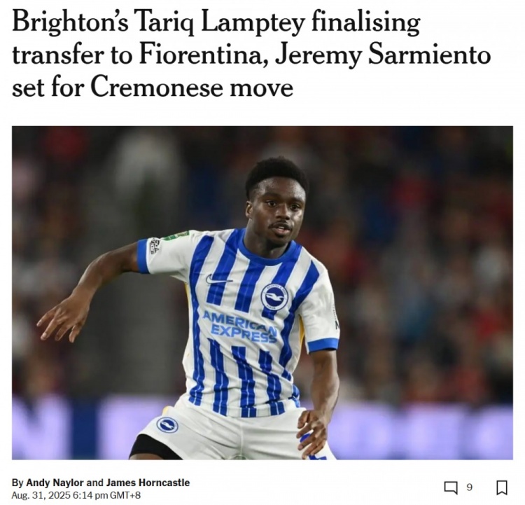 8月31日讯 TA报道,布莱顿两名球员兰普泰以及萨米恩托将转会意甲,分别去往佛罗伦萨以及克雷莫内塞。