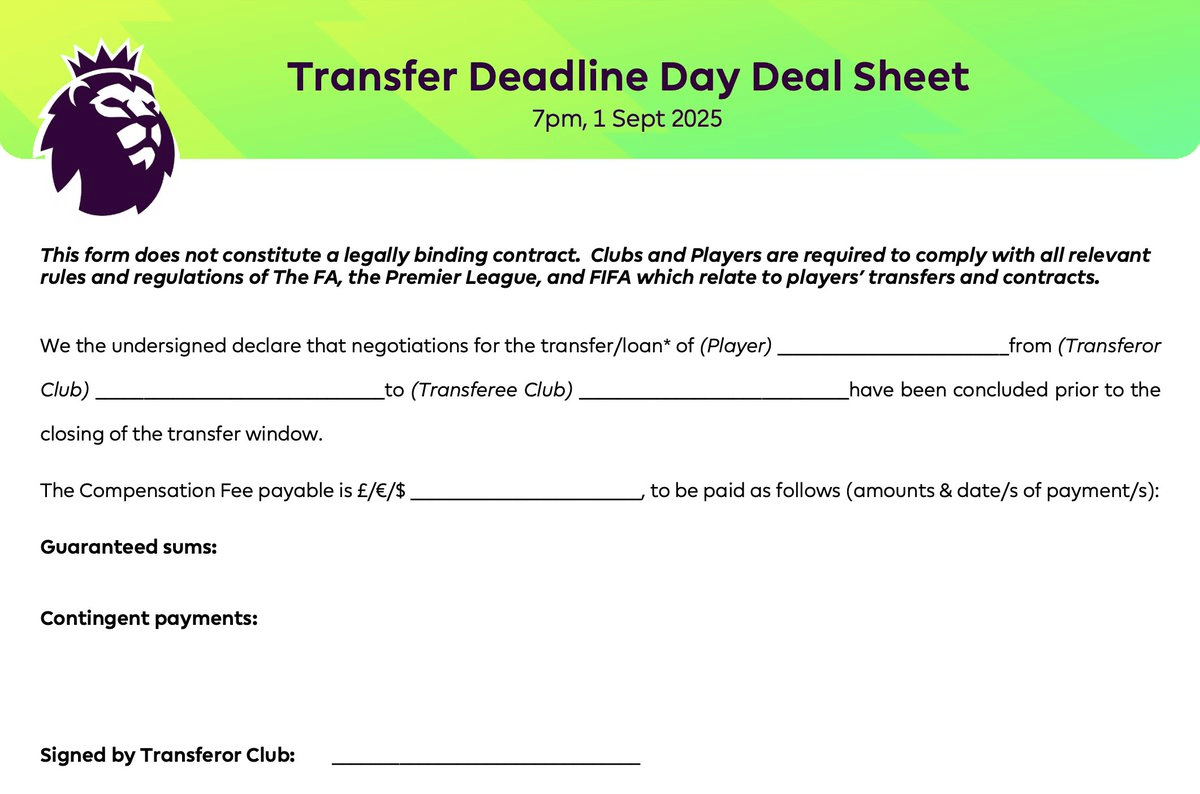 此表格不构成具有法律约束力的合同。俱乐部和球员须遵守英足总英超职业联赛 及国际足联关于球员转会与合同的所有相关规则和规定。