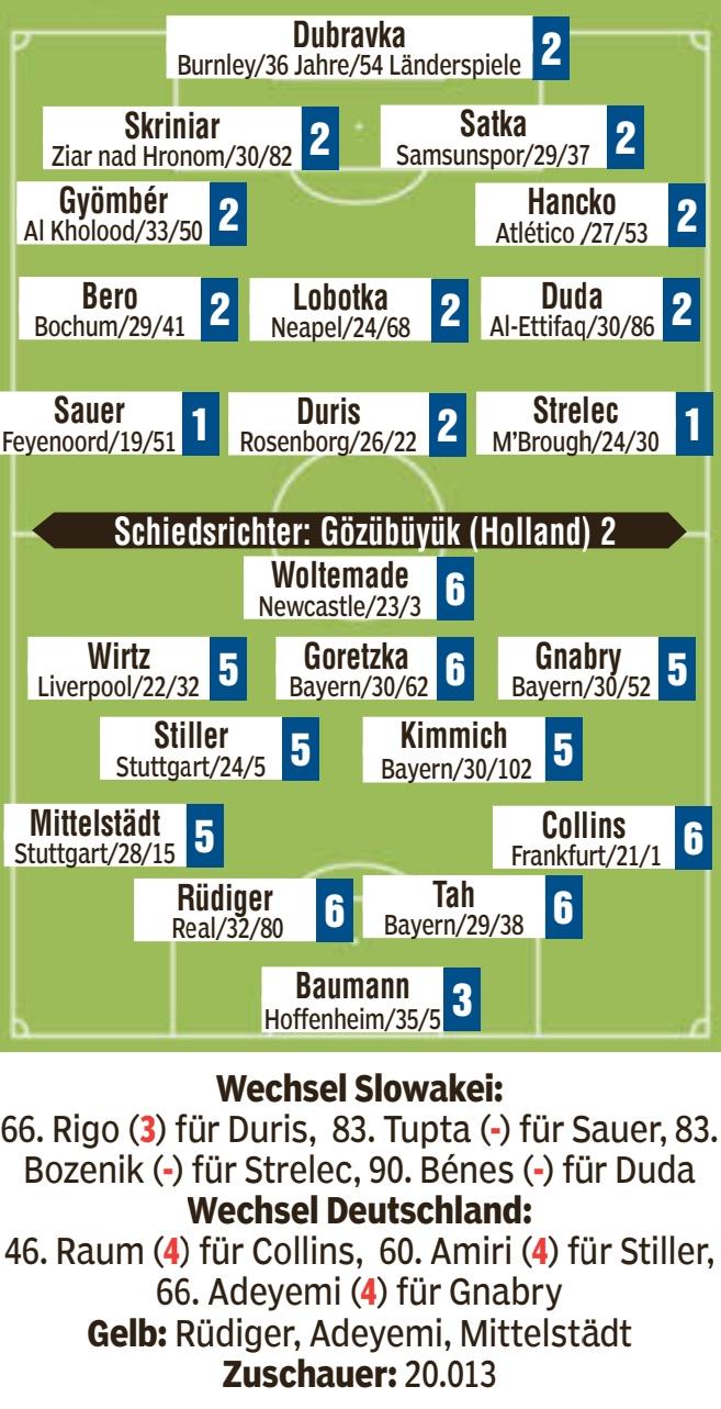 雷速体育9月5日讯 北京时间9月5日凌晨2点45分进行的世界杯赛 欧洲区预选赛第5轮赛事 中最新国际足球新闻,德国队0-2不敌斯洛伐克,本场赛事 结束之后,苏超今日直播在线观看德国媒体《图片报》为双方球员进行了评分。(注:德国媒体评分为1分最高,6分最低)