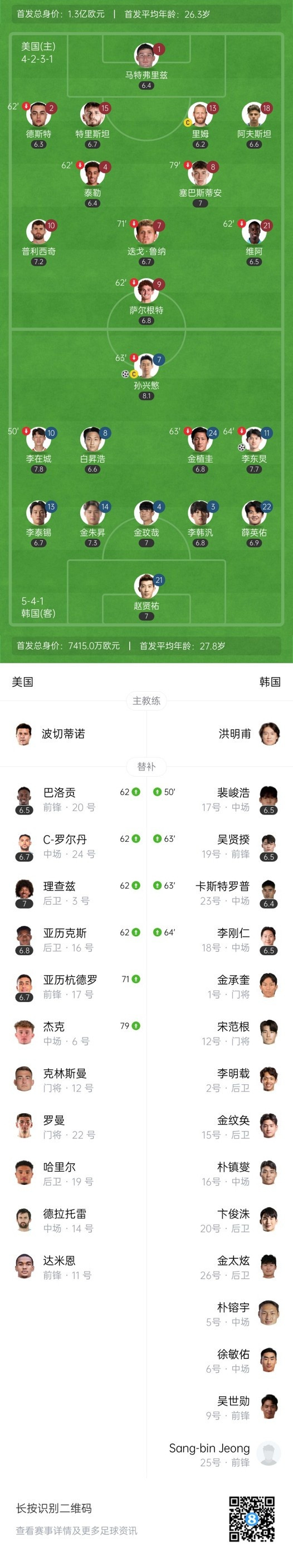 第17分钟,韩国首开记录!李在城左路直塞给到孙兴慜到危险区域 小角度抽射破门,美国0-1韩国。↓