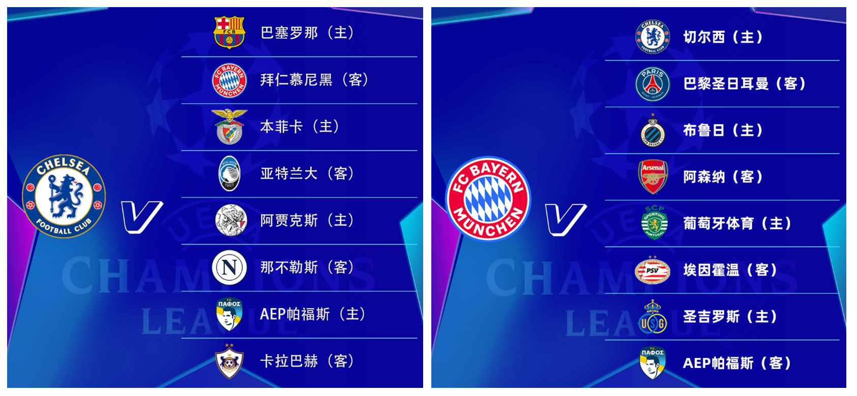 经过抽签,切尔西的八个对手分别为拜仁(客)、巴萨(主)、本菲卡(主)、亚特兰大(客)、阿贾克斯(主)、那不勒斯(客)、帕福斯(主)、卡拉巴赫(客),以及拜仁的八个对手分别为切尔西(主)、巴黎(客)、布鲁日(主)、阿森纳(客)、葡萄牙体育(主)、埃因霍温(客)、圣吉罗斯(主)、帕福斯(客)。